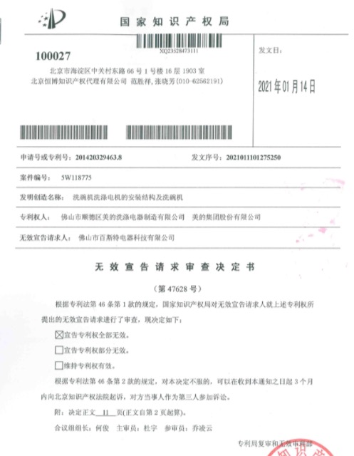 2021年1月14日,国家知识产权发出第47628号无效决定,宣告佛山市顺德区美的洗涤电器制造有限公司、美的集团股份有限公司所拥有的、名称为“洗碗机洗涤电机的安装结构及洗碗机”的专利权全部无效(图片仅供参考,与上述专利无关)。