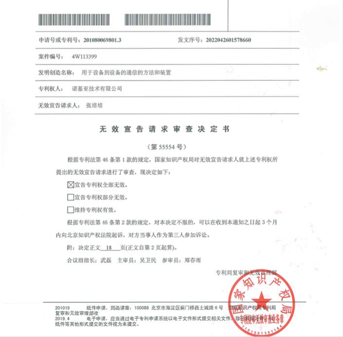 2022年4月29日,国家知识产权发出第55554号无效决定,宣告诺基亚技术有限公司拥有的、名称为“用于设备到设备的通信的方法和装置”的专利权全部无效。