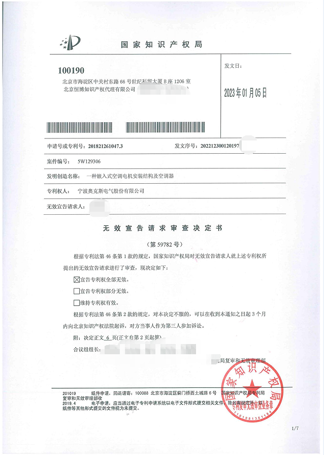 2023年01月05日,国家知识产权局发出第59782号无效决定,宣告宁波奥克斯电气股份有限公司拥有的、名称为“一种嵌入式空调电机安装结构及空调器”的专利权全部无效。