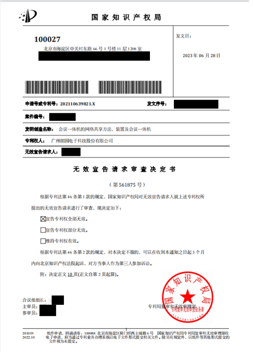 2023年06月28日,国家知识产权发出第561875号无效决定,宣告广州朗国电子科技股份有限公司拥有的、名称为“会议一体机的网络共享方法、装置及会议一体”的专利权全部无效。