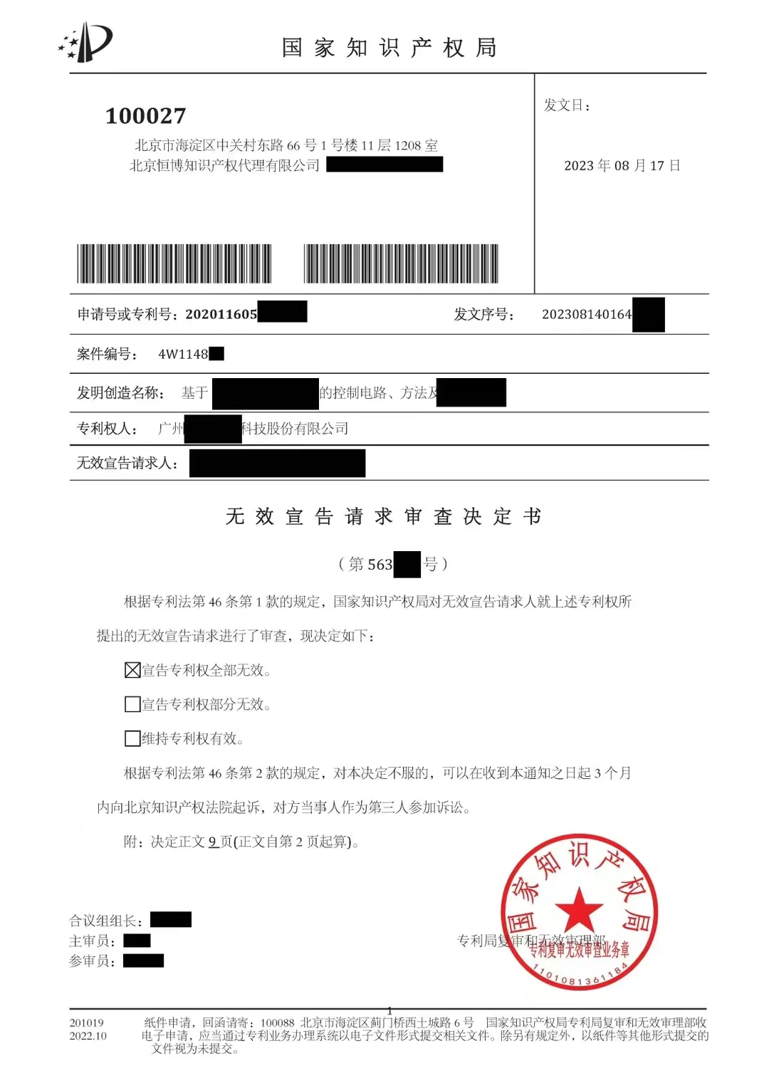 2023年08月17日,国家知识产权发出第563281号无效决定,宣告广州朗国电子科技股份有限公司拥有的、名称为“基于 USB-C唤醒一体机的控制电路、方法及一体机”的专利权全部无效。