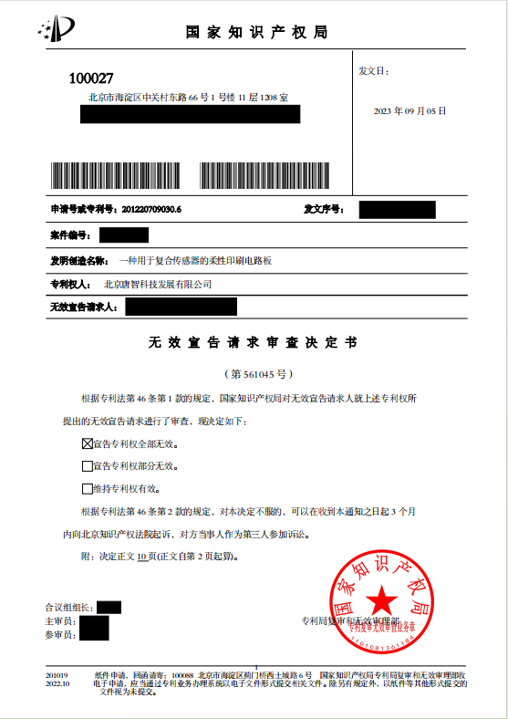 2023年09月05日,国家知识产权发出第561045号无效决定,宣告北京唐智科技发展有限公司拥有的、名称为“一种用于复合传感器的柔性印刷电路板”的专利权全部无效。