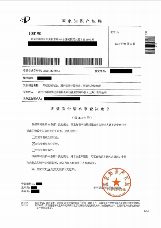 2024年4月09日,国家知识产权发出第561076号无效决定,宣告浙江口碑网络技术有限公司拉扎斯网络科技(上海)有限公司拥有的、名称为“开柜控制方法、用户端及计算设备、计算机存储介质”的专利权部分无效。