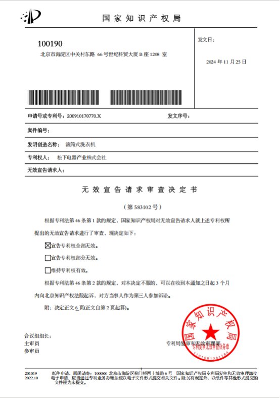 2024年11月25日,国家知识产权发出第583102号无效决定,宣告松下电器产业株式会社拥有的、名称为“滚筒式洗衣机 ”的专利权全部无效。