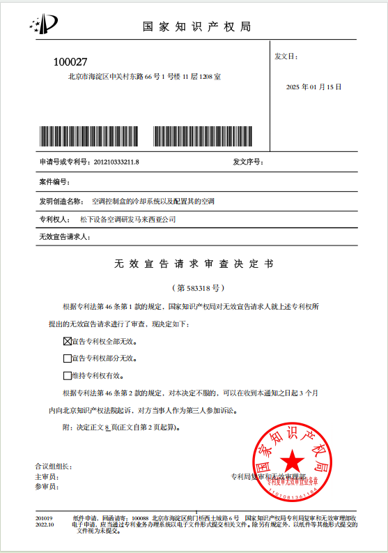 2025年1月15日,国家知识产权发出第583318号无效决定,宣告松下设备空调研发马来西亚公司拥有的、名称为“空调控制盒的冷却系统以及配置其的空调 ”的专利权全部无效。